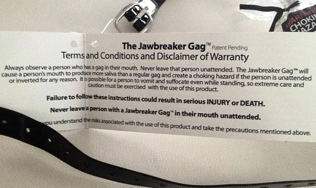 It provides: “Failure to comply with these directions might end in severe harm or loss of life.. By no means depart an individual with a Jawbreaker Gag of their mouth unattended.”