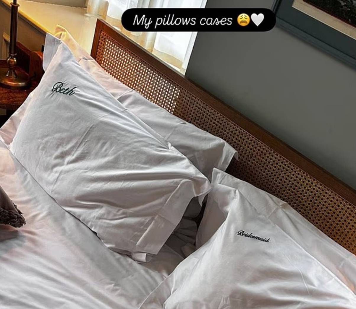 She was additionally given themed pillowcases with ‘Beth’ and ‘Bridesmaid’ stitched onto them, in addition to a set of pyjamas, a sleep masks and a handkerchief with the date of the marriage embroidered onto it.