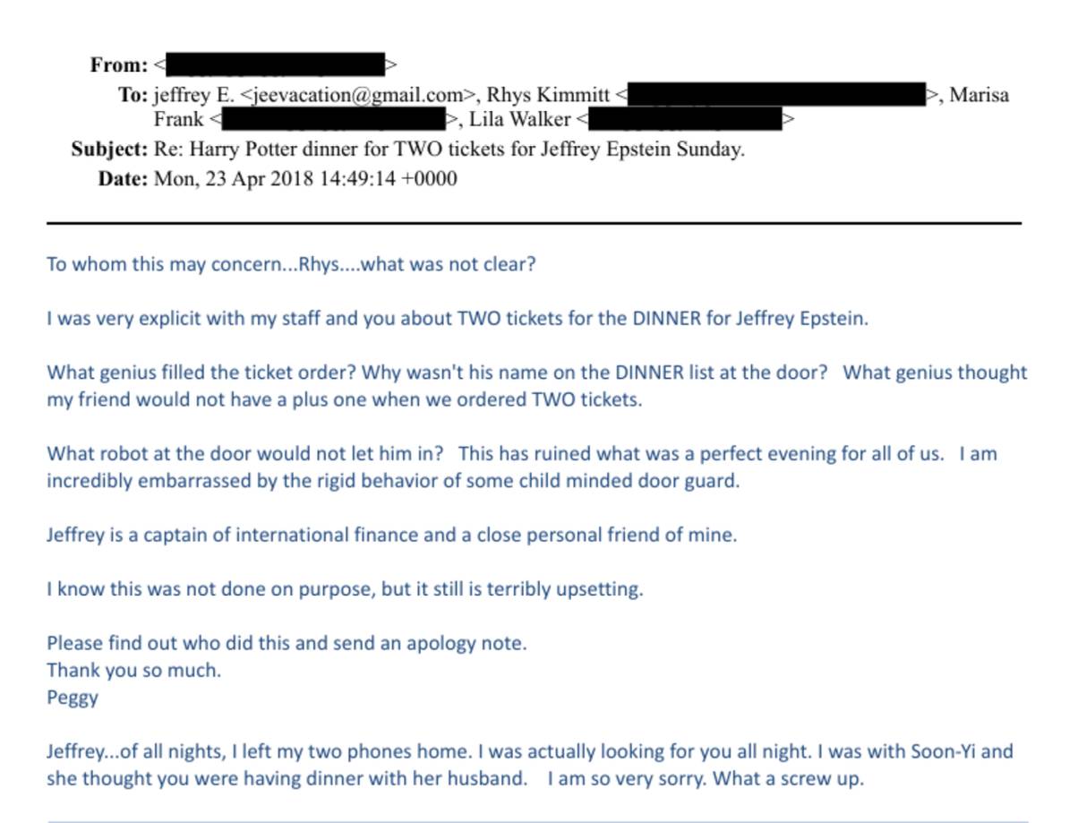 Finally Epstein was truly unable to attend after a mix-up solely gave him one ticket and noticed him stopped on the door, resulting in Siegal sending a livid e-mail by which she referred to the notorious late paedophile as ‘a captain of worldwide finance and a detailed private buddy of mine’.