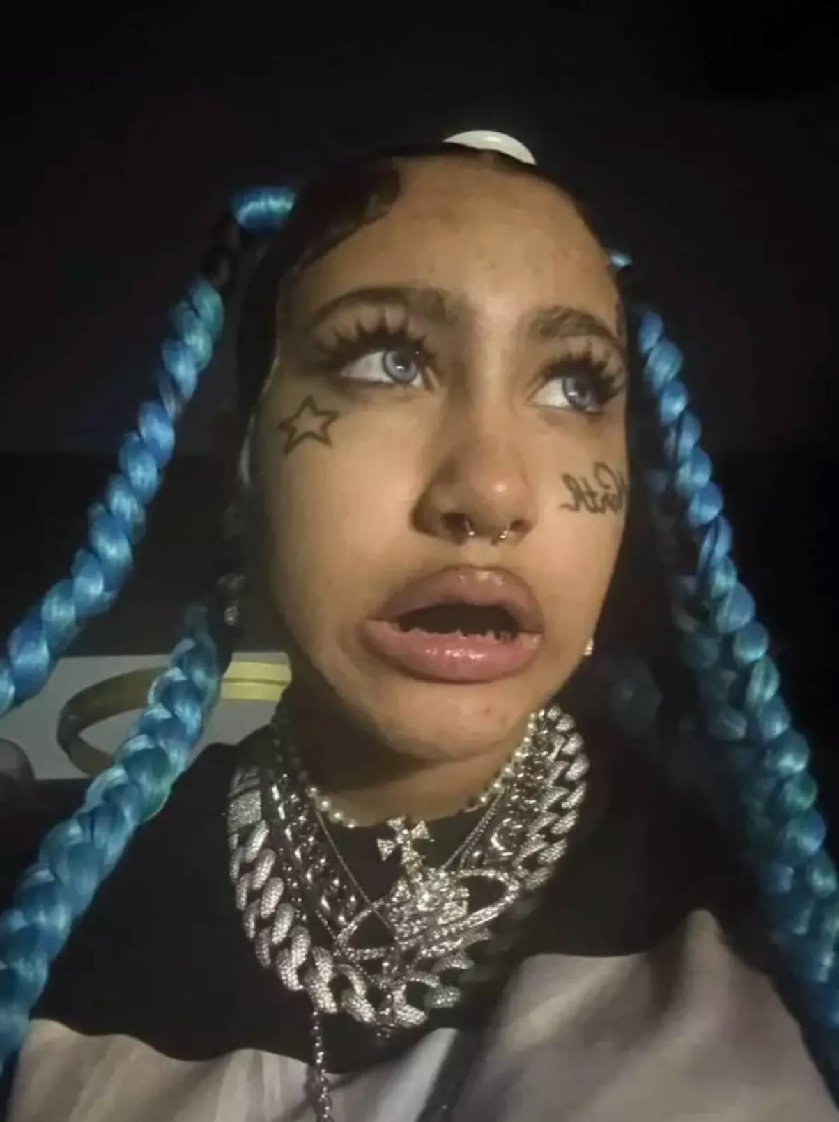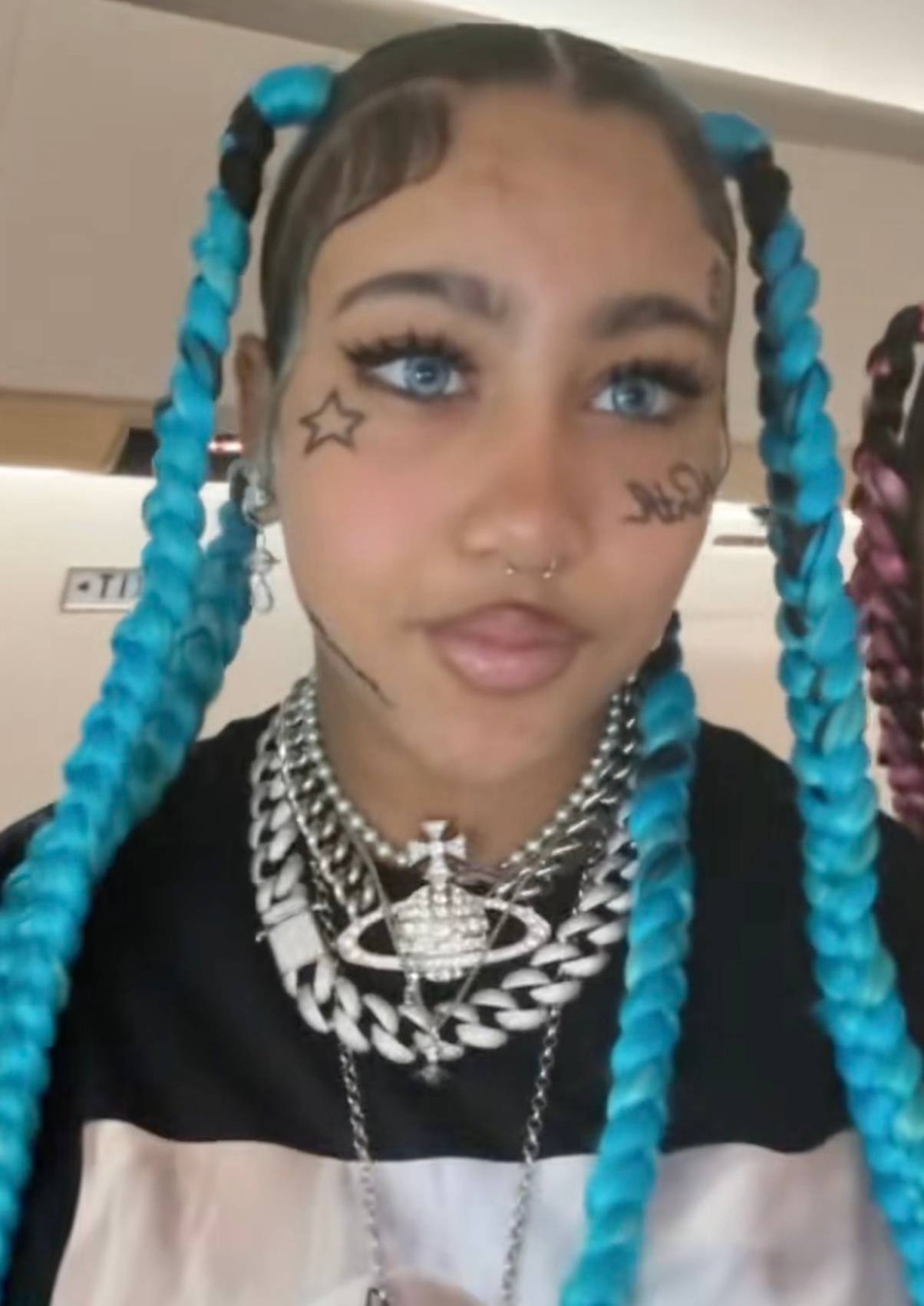 She not too long ago shared snaps on-line of her sporting brilliant blue braids, two faux face tattoos, a couple of extra piercings and a black grill in her mouth.