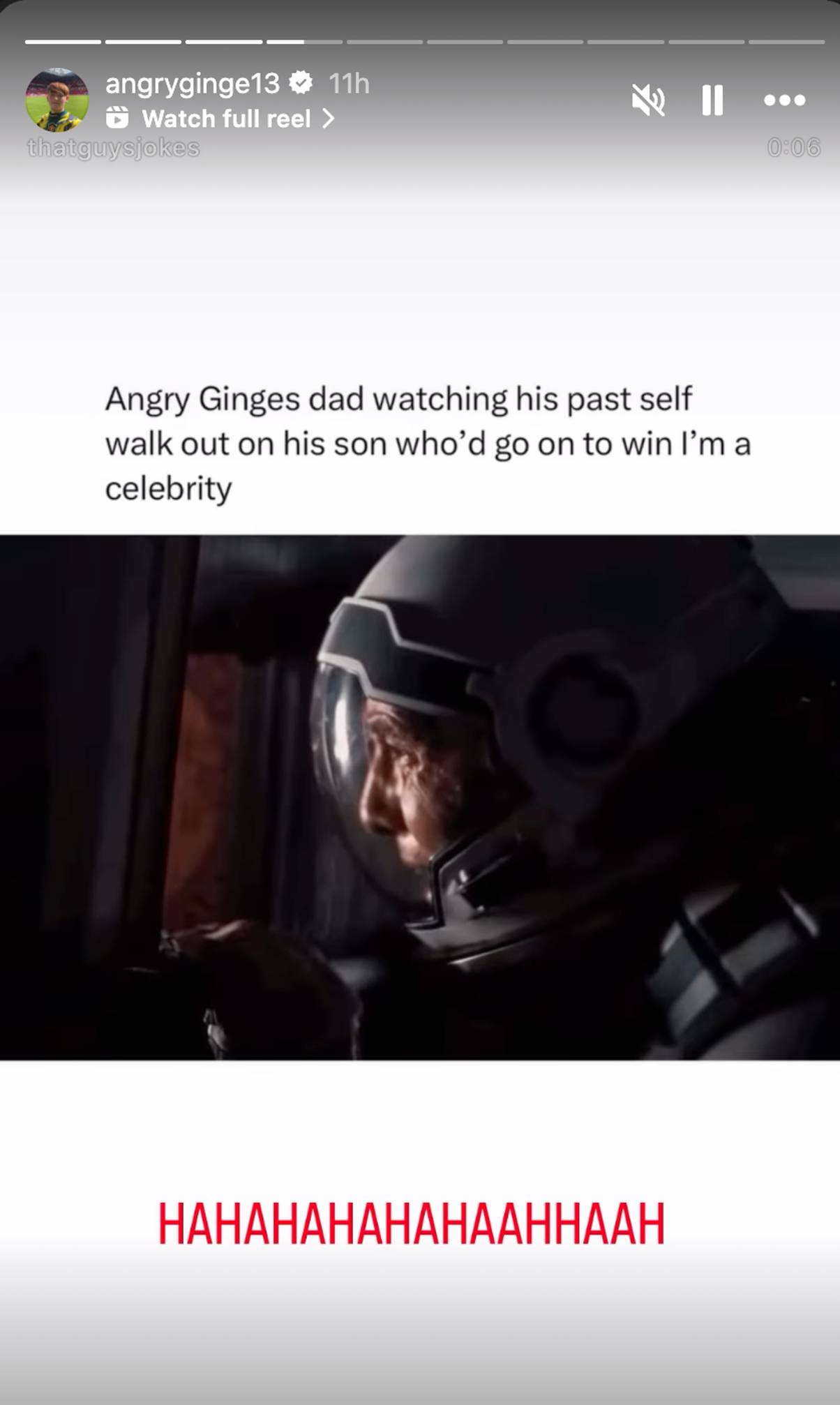 Ginge reposted a meme to his Instagram story mocking his dad, posting a clip from Interstellar with the caption: “Offended Ginges dad watching his previous self stroll out on his son who’d go on to win I’m A Celeb.”
