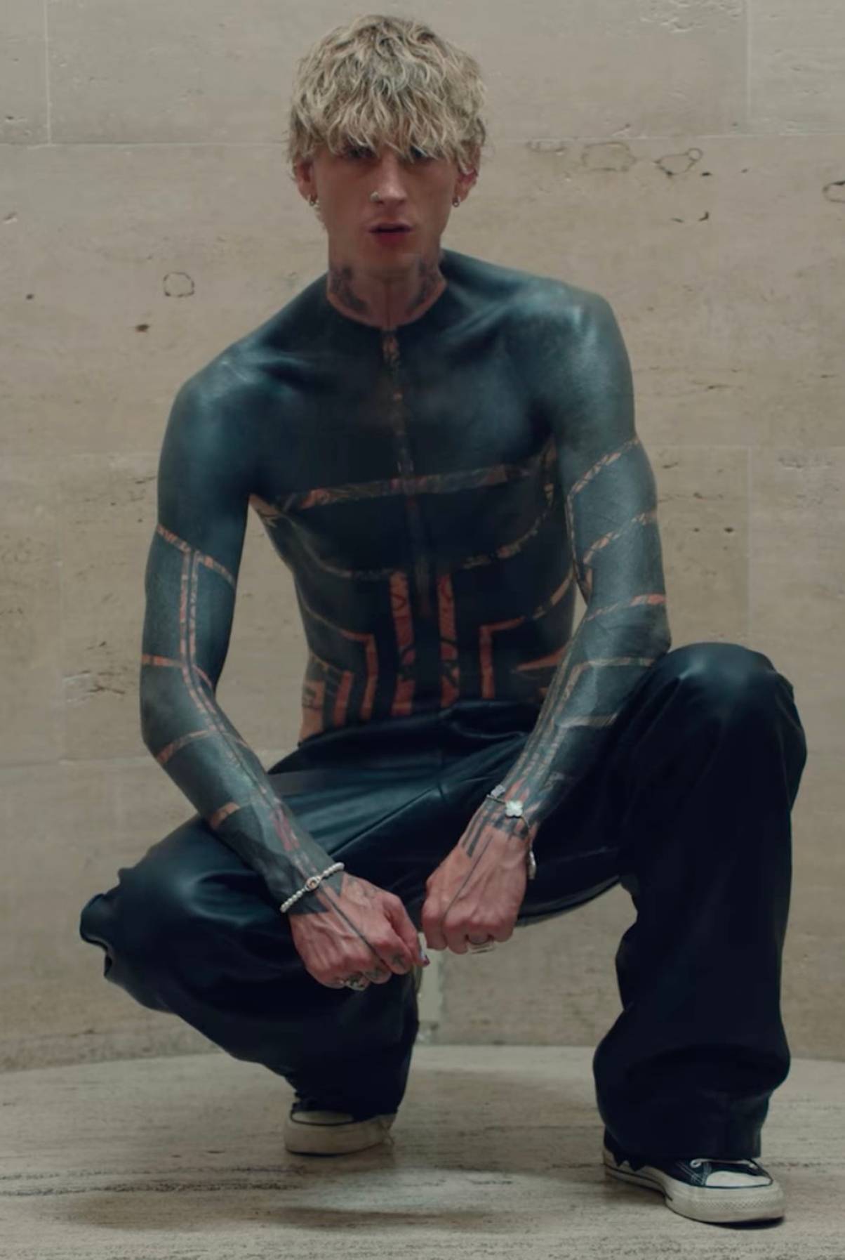 Rapper Machine Gun Kelly later adopted go well with for comparable causes, explaining he had numerous ‘chaotic’ designs on his pores and skin that not ‘resonated’ with him – so he bought rid by getting a blackout tattoo throughout most of his higher physique.
