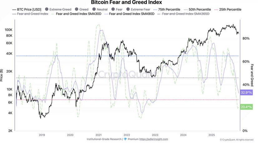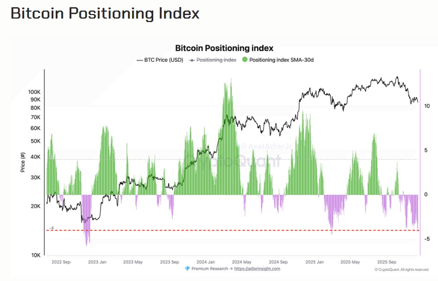 According to on-chain analyst Axel Adler, the main cause lies primarily in the derivatives market. The futures market is clearly under bearish pressure driven. Two central indicators provide consistent signals: the Bitcoin Position Index and the Fear and Greed Index.