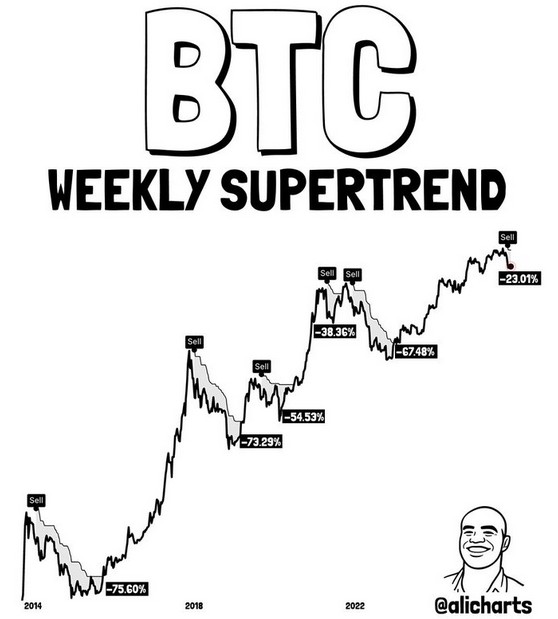 Technical analyst Ali Charts warns ahead of a possible sharp decline in Bitcoin as the SuperTrend indicator on the weekly chart recently triggered a sell signal. Historically, such signals have been followed by massive corrections, including declines of up to 75% in previous cycles such as 2014, 2018 and 2022.