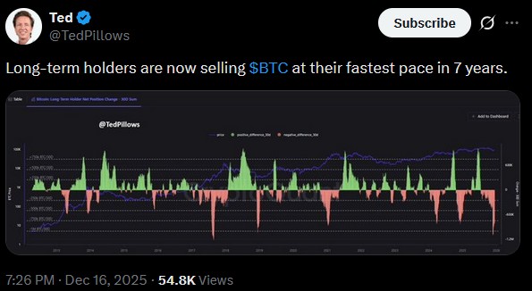 Sea Analyst Ted Long-term BTC hodlers are currently selling their holdings as quickly as they did 7 years ago. Such a development can often be observed at the end of a bullish cycle, as the diamond hands then also realize profits and this creates strong selling pressure.