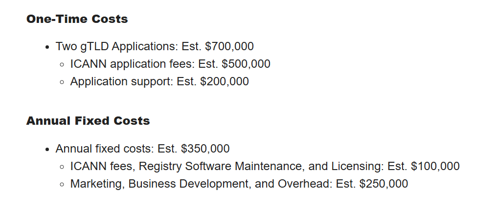 Annual fixed costs are estimated at $350,000, including ICANN, registry maintenance and licensing, marketing, business development and overhead costs. Variable expenses depend on sales in the domain and are expected to be offset by revenue. No own funds are requested.