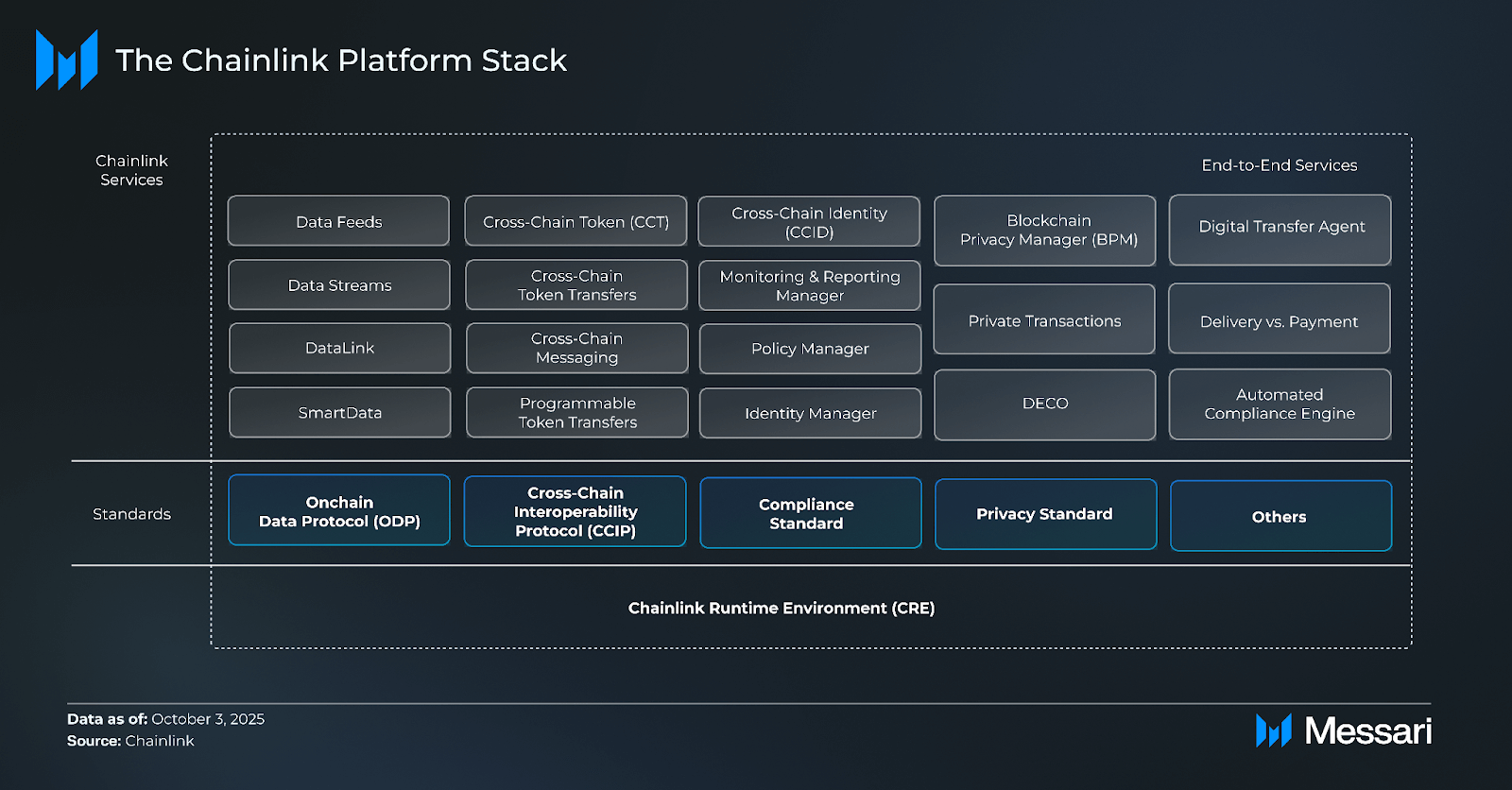 In addition, the technology package now includes Data Feeds, Data Streams, SmartData, cross-chain interaction through CCIP, Automated Compliance Engine (ACE), private computation platforms and the Chainlink Runtime Environment (CRE).