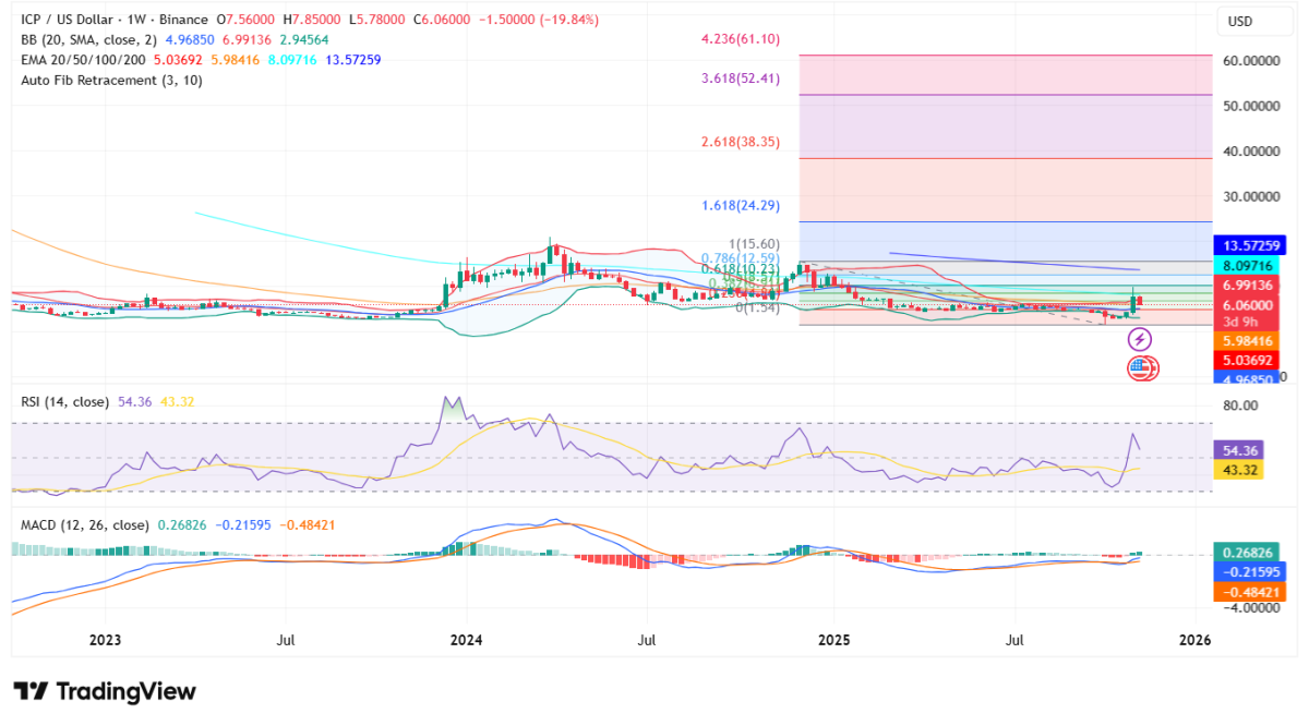 From a technical analysis perspective, ICP’s weekly chart is mixed and has a cautiously optimistic tone. The ICP token recently reached a high of around $7.85 but then fell back to $6.06, a drop of almost 20%.