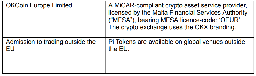 Pi Network intends to apply for market approvals to list PI on multiple MiCA compliant exchanges. The first expected platform is OKCoin Europe Limited, operating under the brand name OKX and licensed by the Malta Financial Services Authority under the code OEUR.