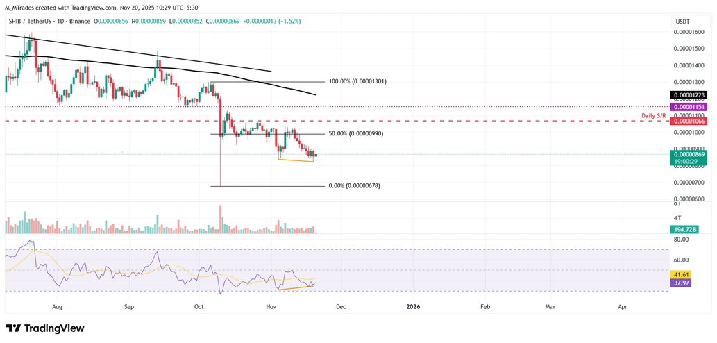 Shiba Inu encountered resistance near $0.0000099 on November 13, causing the price to fall by almost 10% by Wednesday. Currently, the token is trading around $0.0000086. The RSI on the daily chart shows a bullish divergence, meaning the price fell while the RSI remained high, often indicating a possible trend reversal or short-term rise.