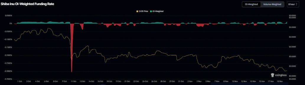 Derivatives metrics also support the positive outlook. Coinglass’s OI-weighted funding rate shows that more traders expect SHIB to rise than fall. The funding rate turned positive on Tuesday and reached 0.012% on Thursday, the highest level since early October. These shifts in funding rates often occur before strong price recoveries.