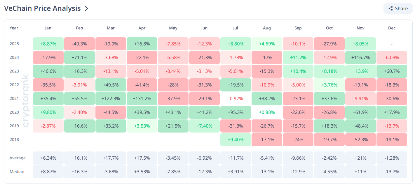After VeChain published White’s comment, interest grew, although VET remained much lower than before the October plunge. Weekly gains rose over 20%, bringing relief to some holders. Seasonal trends suggest November could improve, but traders remained cautious and avoided adding further positions in recent sessions.