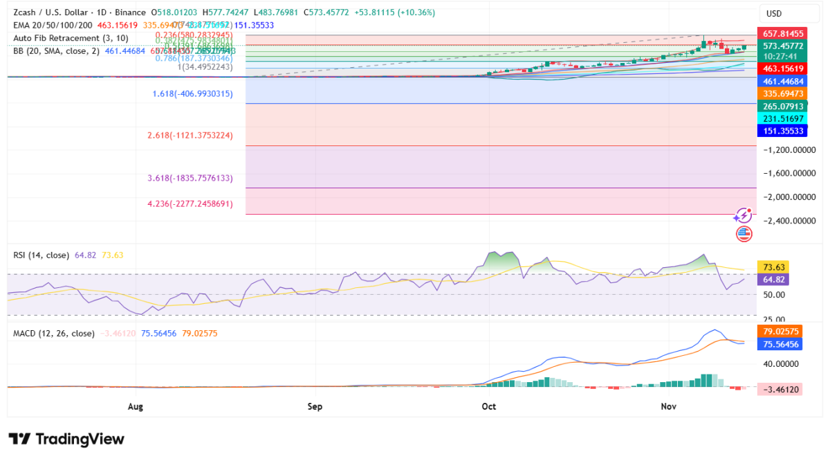 Zcash price has surged following the Winklevoss action and is now trading at $572.03 after rising nearly 14% in the last 24 hours.